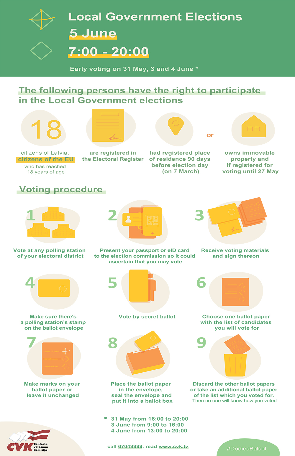 ! In view of the amendments to the Law adopted by the Saeima, local government elections in the Madona municipality WILL TAKE PLACE on 5 June, the early voting only in this electoral district will be held - on June 3 from 16:00 to 20:00 and on 4 June from 11:00 to 20:00.