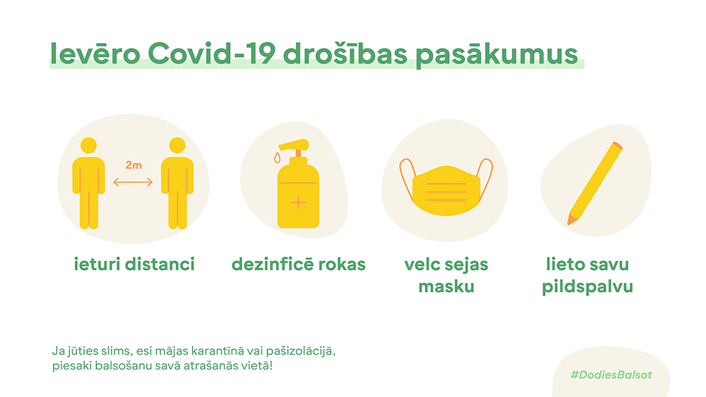 Lai mazinātu vīrusa infekcijas Covid-19 izplatības riskus, vēlētājiem vēlēšanu iecirkņos bija jāievēro drošības pasākumi - jāietur divu metru distance, jādezinficē rokas, jāvelk sejas maska, kā arī ieteicams lietot savu pildspalvu. Ja vēlētājam to nebija līdzi, vienreizlietojamo sejas masku un pildspalvu varēja saņemt iecirknī. Sejas maskas lietošana vēlēšanu iecirkņos bija obligāta. Izņēmums bija personas ar acīmredzamiem kustību traucējumiem vai psihiskās veselības traucējumiem, kuru dēļ personai trūkst spēju vai iemaņu mutes un deguna aizsega lietošanai, kā arī vēlētāju bērni līdz 7 gadu vecumam. Balsotājiem seja uz brīdi bija jāatsedz, uzrādot pasi vai personas apliecību.