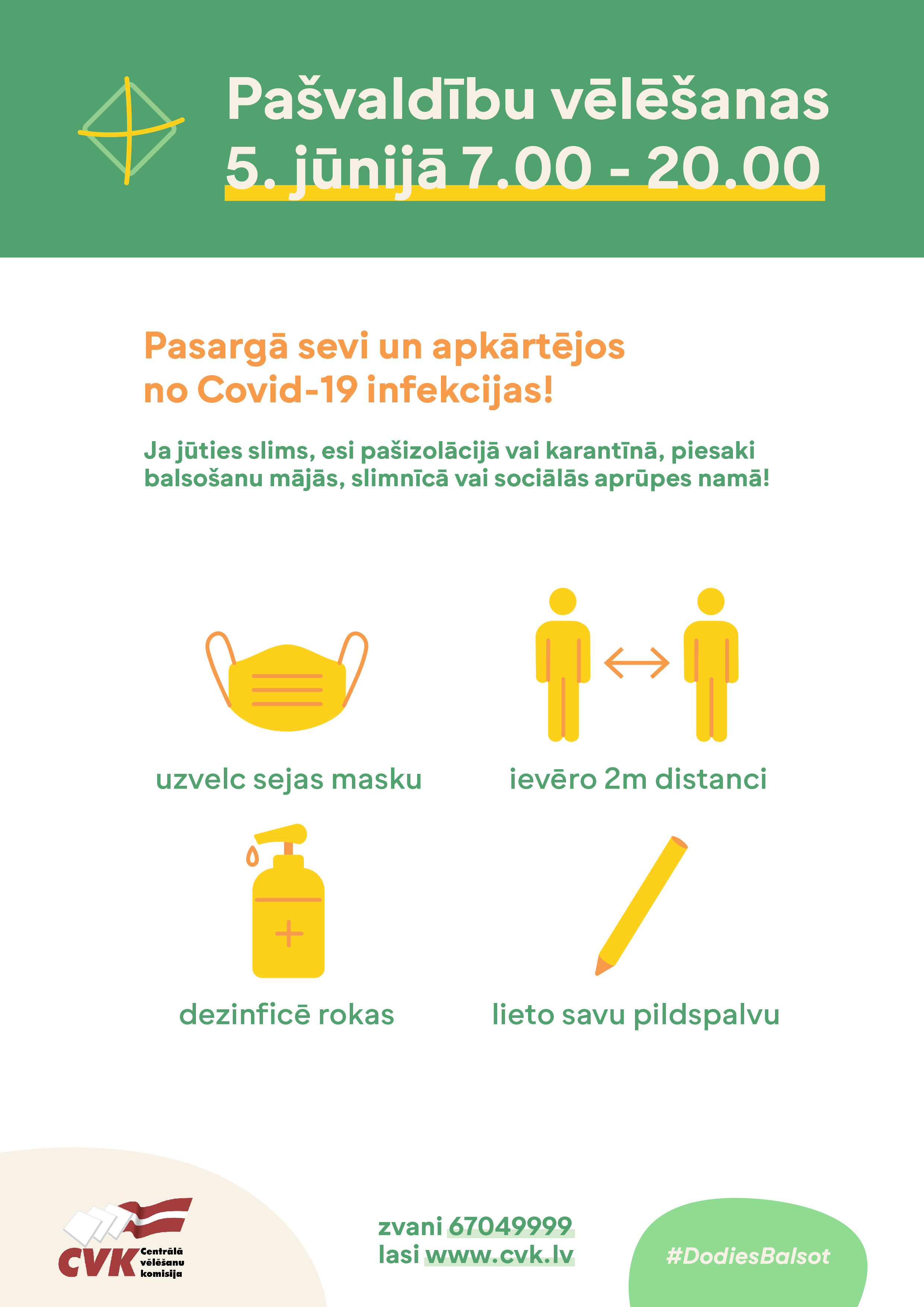 Ieteikumu mērķis – īstenot epidemioloģiskās drošības pasākumus vīrusa infekcijas Covid-19 ierobežošanai 2021. gada pašvaldības domes vēlēšanās.