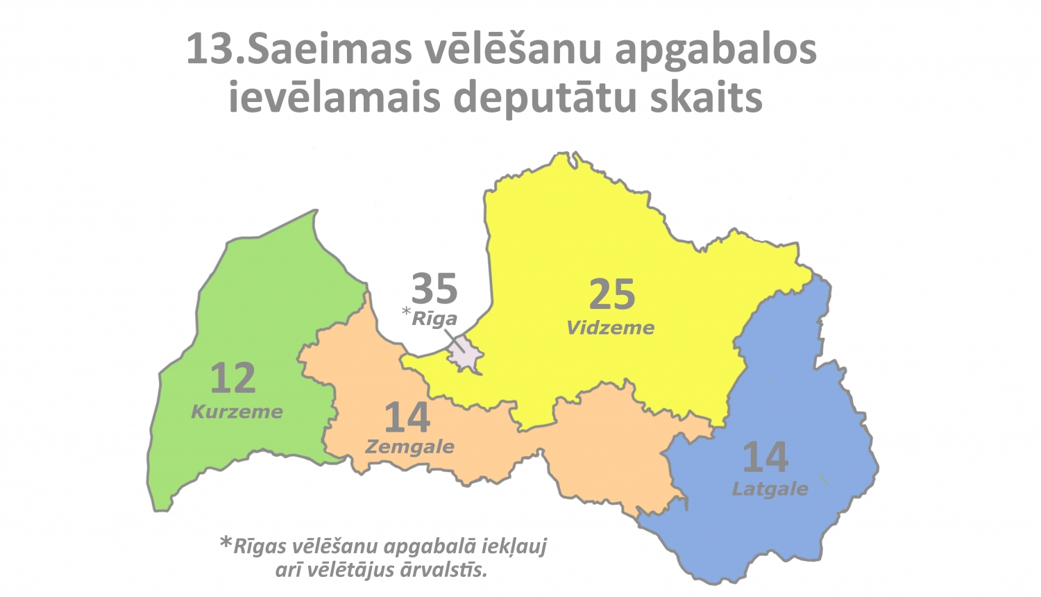 Rīga, 11. jūnijs: Centrālā vēlēšanu komisija (CVK) šodien noteica 13.Saeimas vēlēšanu apgabalos ievēlamo deputātu skaitu. Rīgas vēlēšanu apgabalā 13.Saeimas vēlēšanās būs 35 deputātu vietas, Vidzemes vēlēšanu apgabalā – 25 deputātu vietas, Latgales un Zemgales vēlēšanu apgabalos katrā pa 14 deputātu vietām, bet Kurzemes vēlēšanu apgabalā – 12 deputātu vietas.